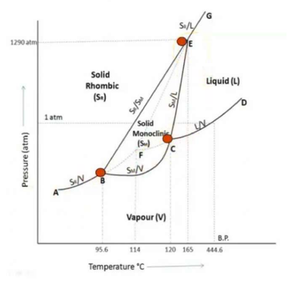 蒸気圧曲線だけで分からない点を状態図で確認すると、硫黄の三重点は95℃付近に三重点があります。