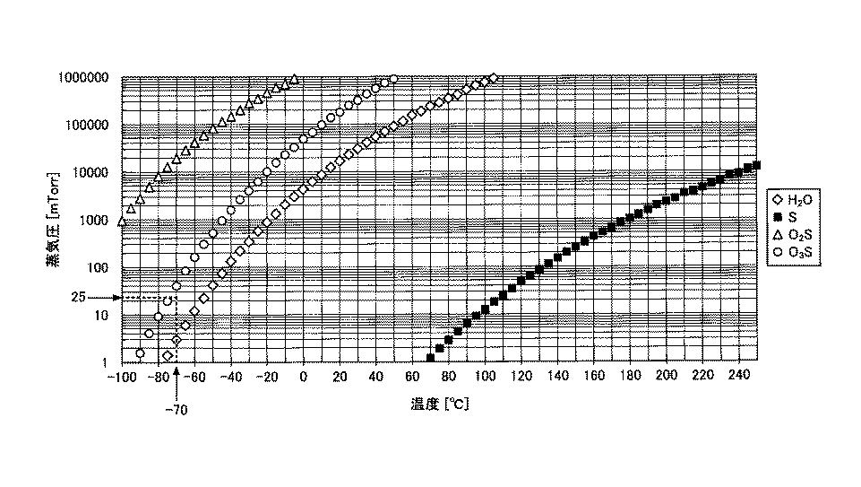 『図7の硫黄Sの蒸気圧曲線によれば、処理容器内10を、例えば15~25mTorr(2.0~3.3Pa)の高真空に制御し、ウェハWの温度を0℃以下にすることで硫黄Sは固体のままエッチング壁に留まることがわかる。加えて、図7の硫黄Sの蒸気圧曲線によれば、処理容器10の内壁の温度を70℃程度にすると硫黄Sが揮発することがわかる。』