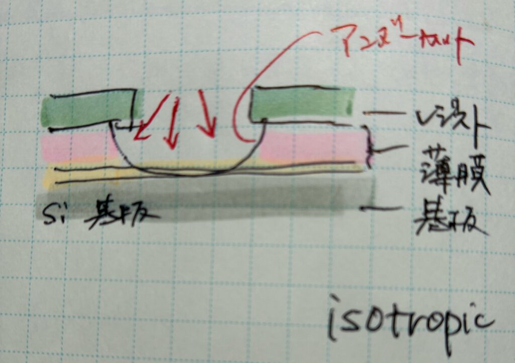 「等方的」とは、垂直方向(深さ方向)も横方向(パターンの幅方向)も均一に削れていくイメージです。そのため、設計したパターン寸法との誤差が大きくなることがあります。