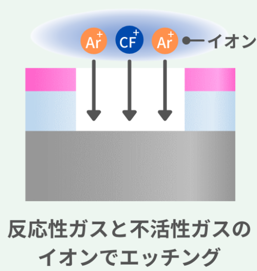 プラズマ中で生じたラジカルが化学エッチングを、イオンが物理エッチングを担います。