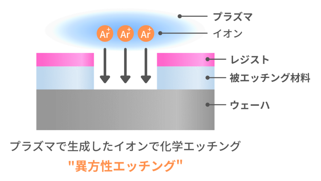 一方ドライエッチングは、ウェットエッチングの薬液の代わりにプラズマ中のイオン・活性種を使ってエッチングします。
